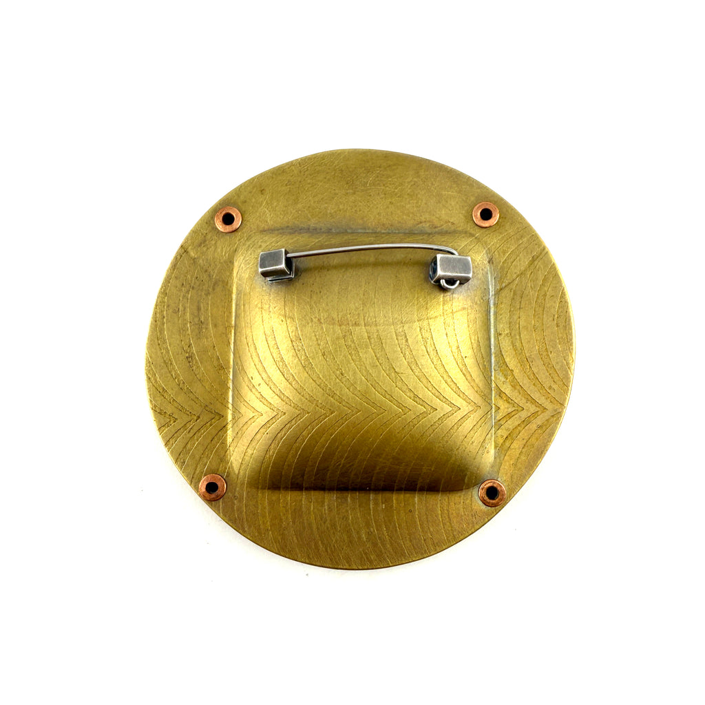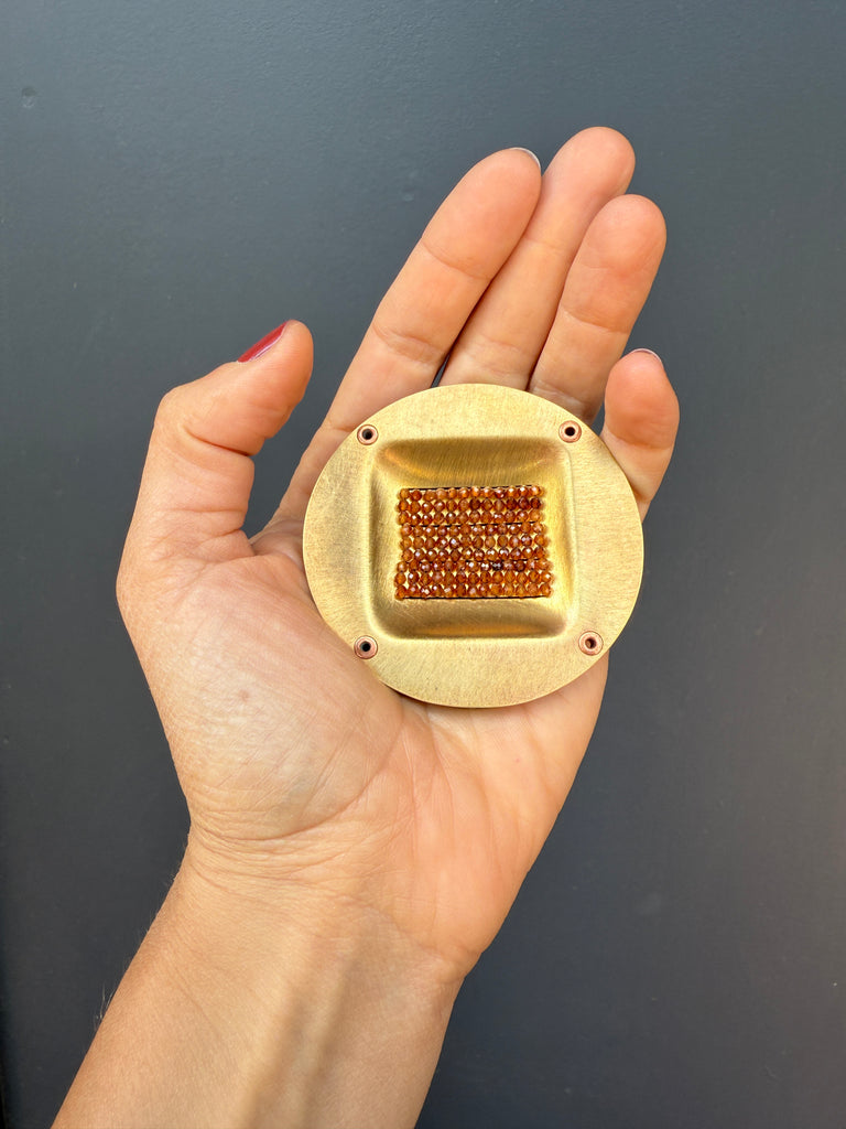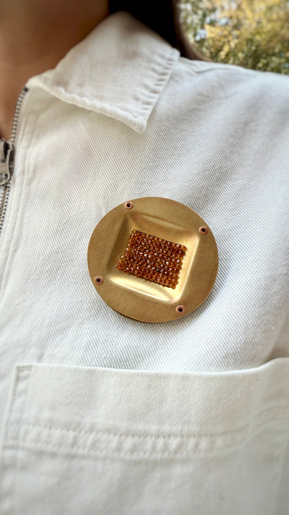 "This piece is process driven and began with stitching stones in place against the metal. The idea of the hand-work is meant as a counterbalance to the geometric industrial form of the brooch. While the form is geometric, each edge was carefully rounded and softened to serve as a further contrast to the overall form." - Sarah C. Chapman