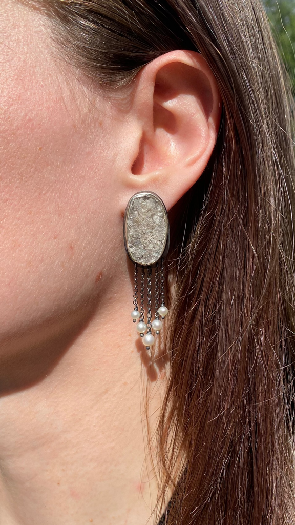 Oxidized sterling silver, natural druzy quartz, fresh water pearls