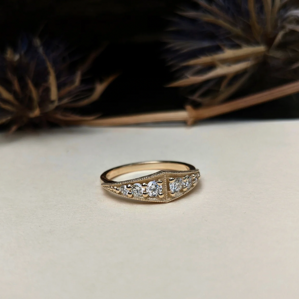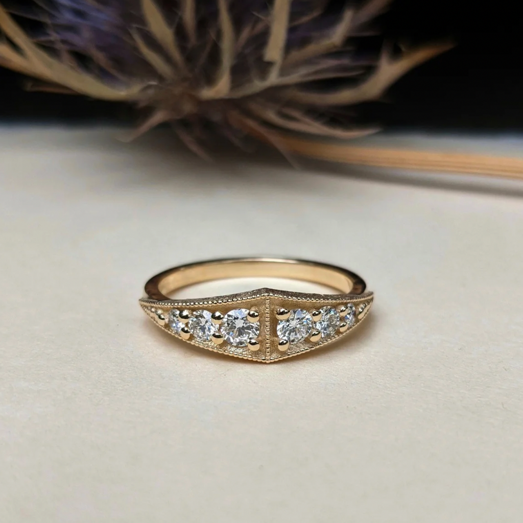 14-karat recycled yellow gold, 2-3mm, 2-2.5mm, 2-2mm SI1-G white round brilliant diamonds. Total carat weight for this ring is 0.38cts.