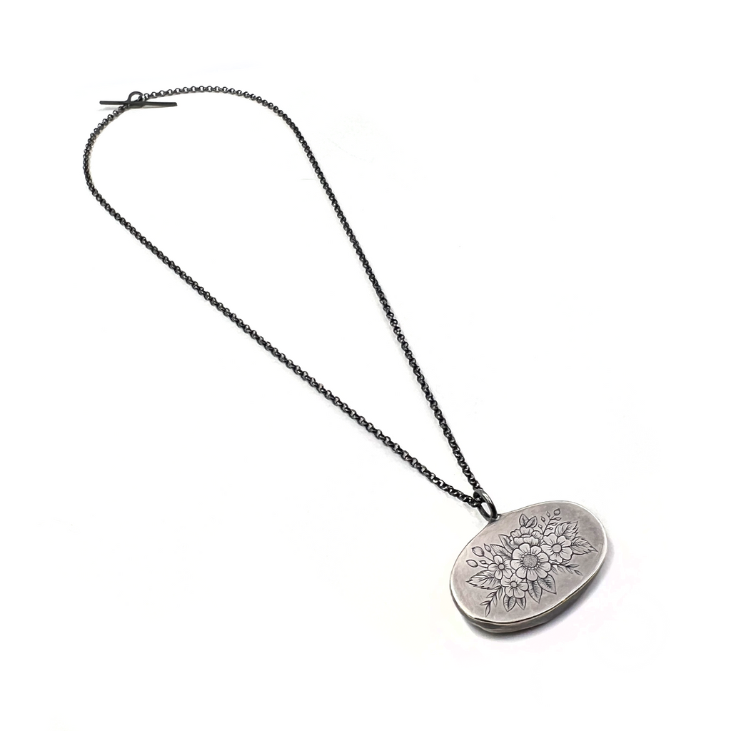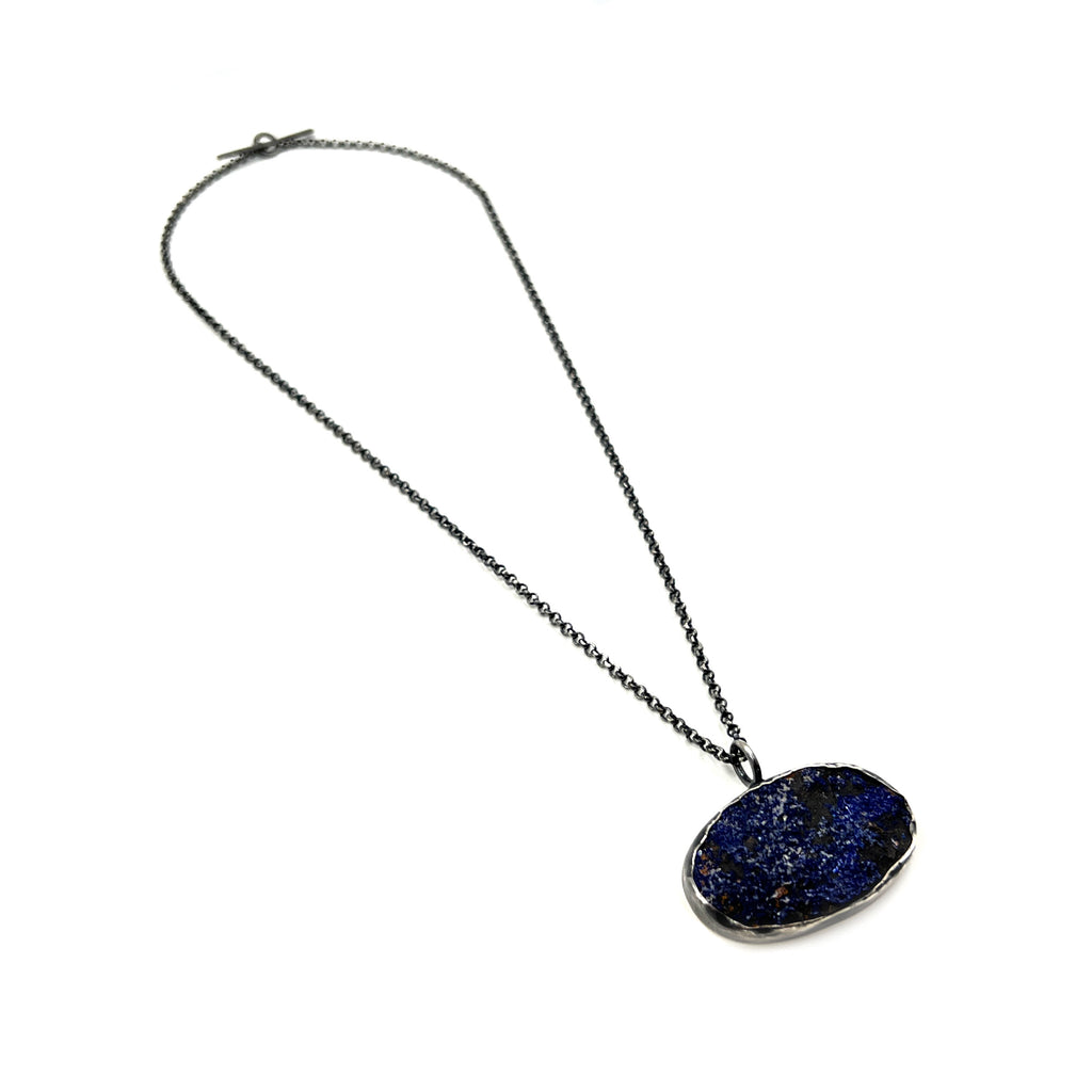 Oxidized sterling silver, azurite, hand-pushed engraving
