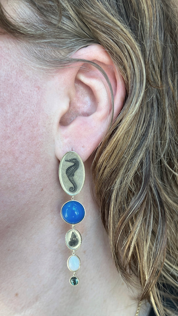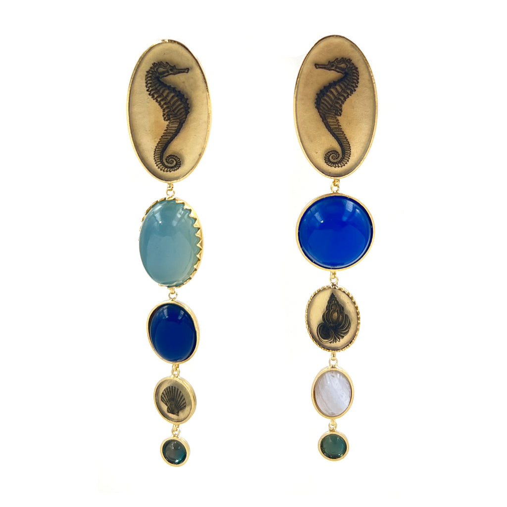 Gold vermeil, hand drawn and fired plastic, blue agate, chalcedony, London blue topaz