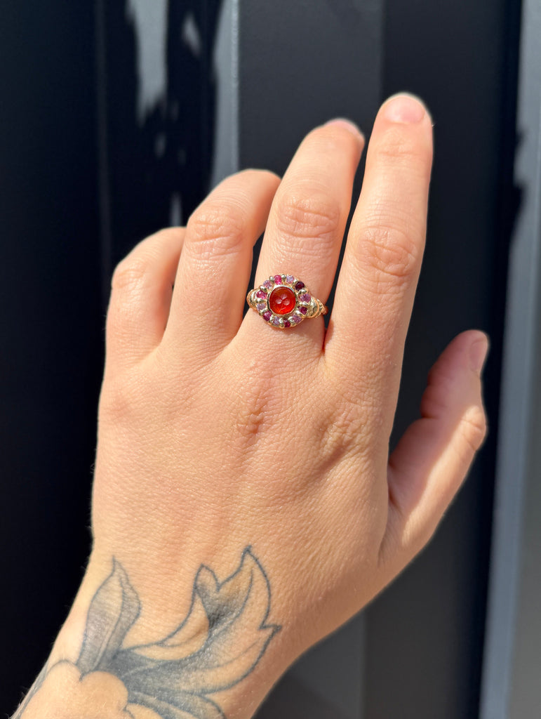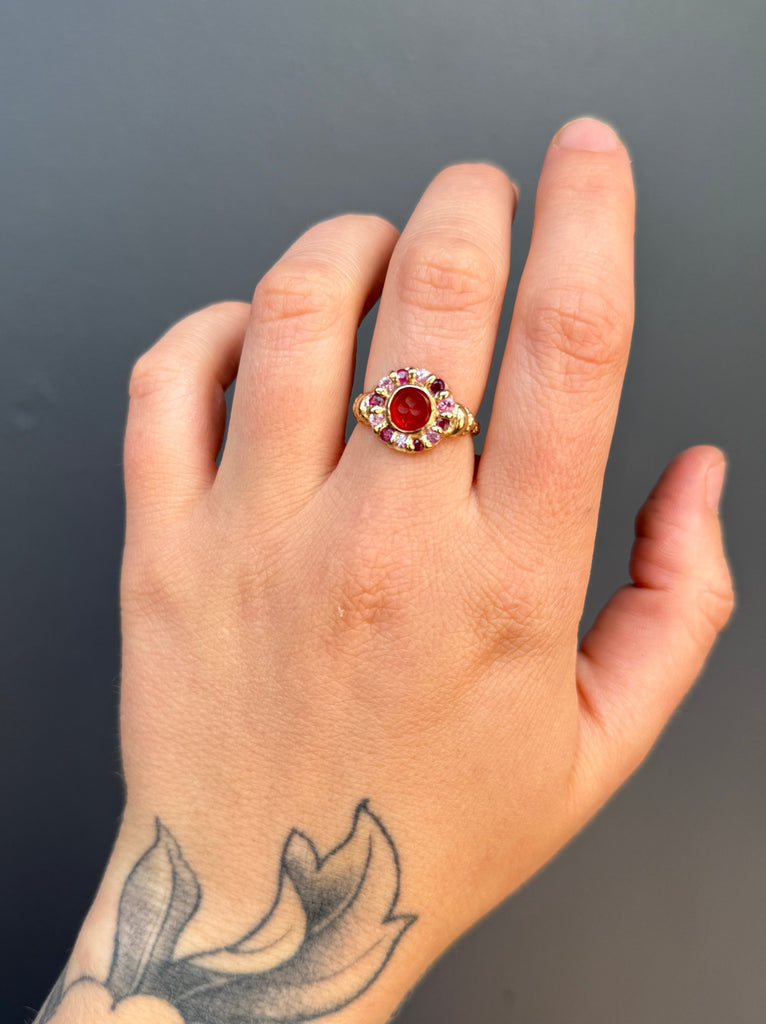 9-karat recycled yellow gold, antique intaglio agate, pink sapphires, rubies