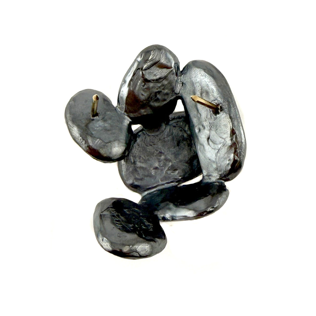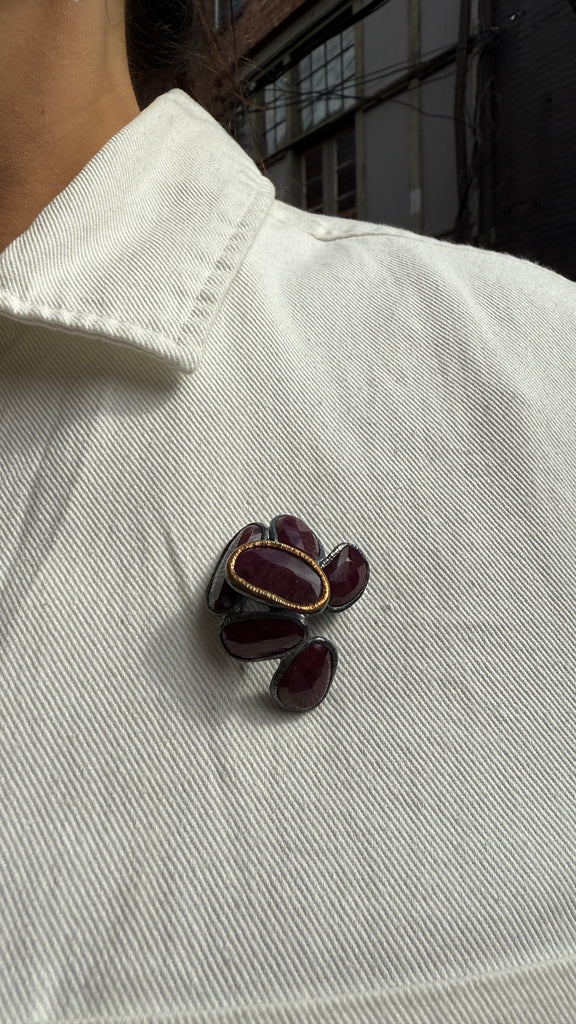 "The pure drama of red, black, and gold in a stunning handmade brooch. Rose cut rubies form the central element of this sculptural beauty, paired with the contrasting colors of oxidized silver and 22 karat gold. An amazing statement brooch can dress up anything and this one is a showstopper! The double pin backs hold the brooch securely." -Shaya Durbin
