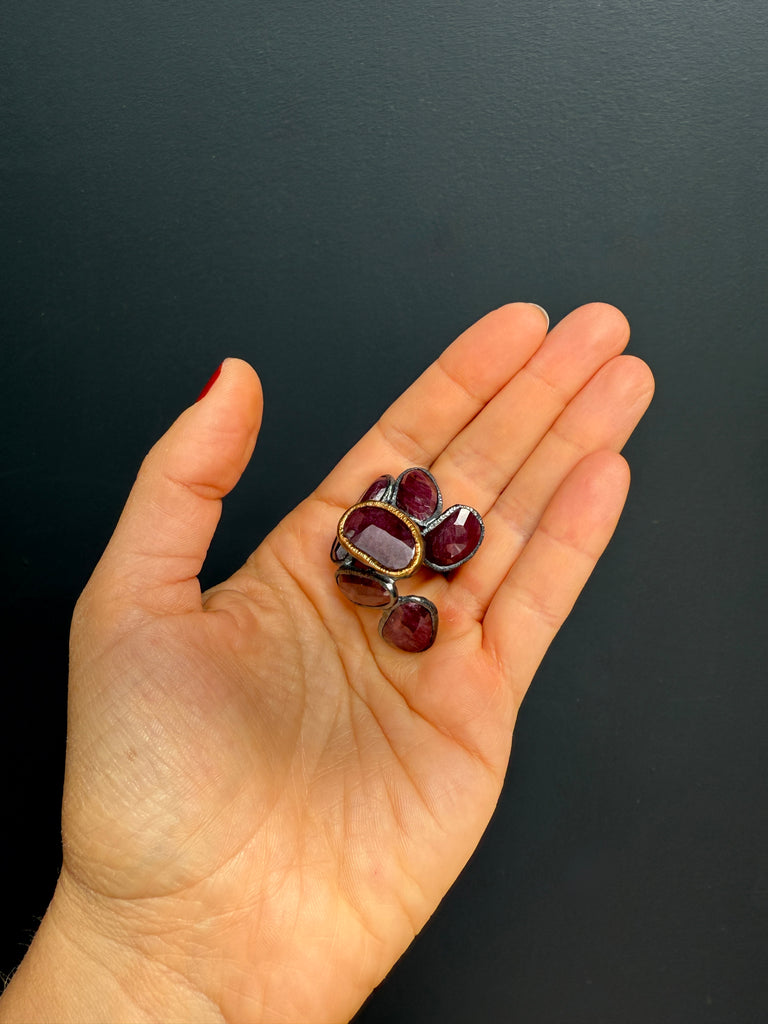 Rose cut rubies, oxidized silver, 22-karat gold, 18-karat gold