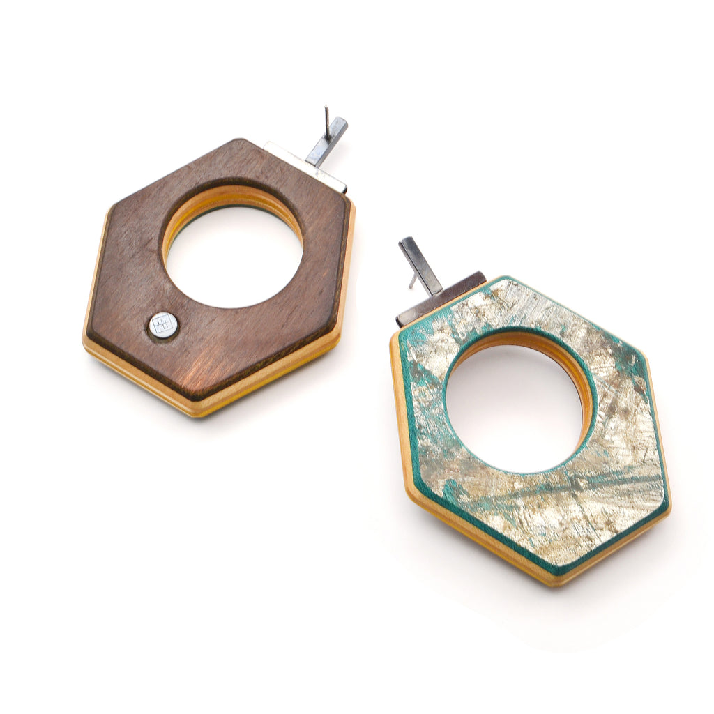 Wood from recycled skateboard decks, oxidized sterling silver