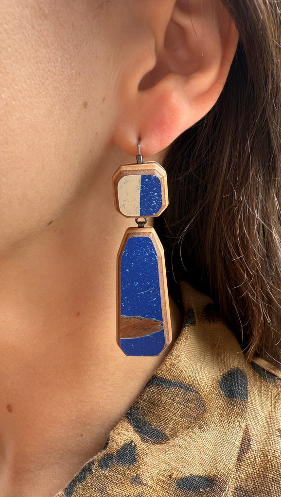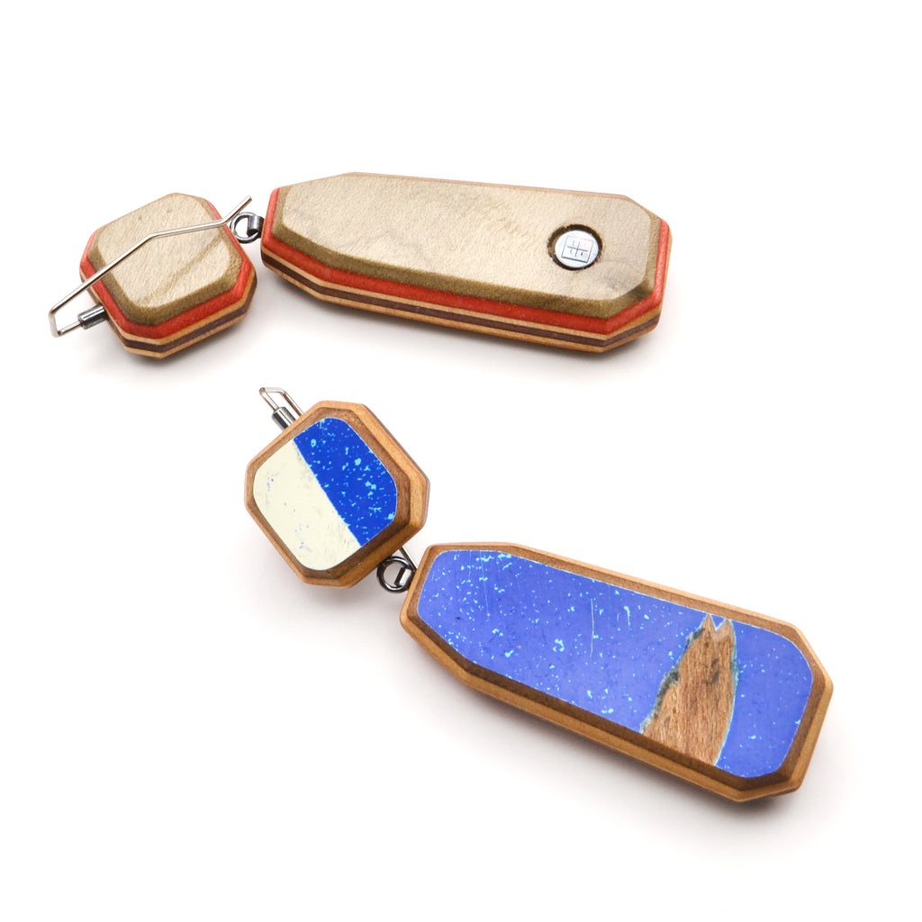 Wood from recycled skateboard decks, oxidized sterling silver, stainless steel