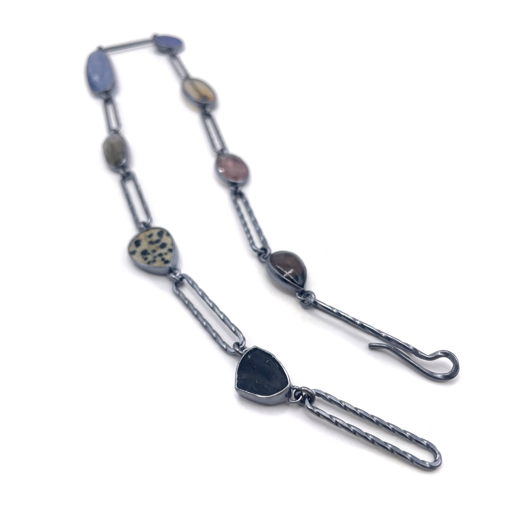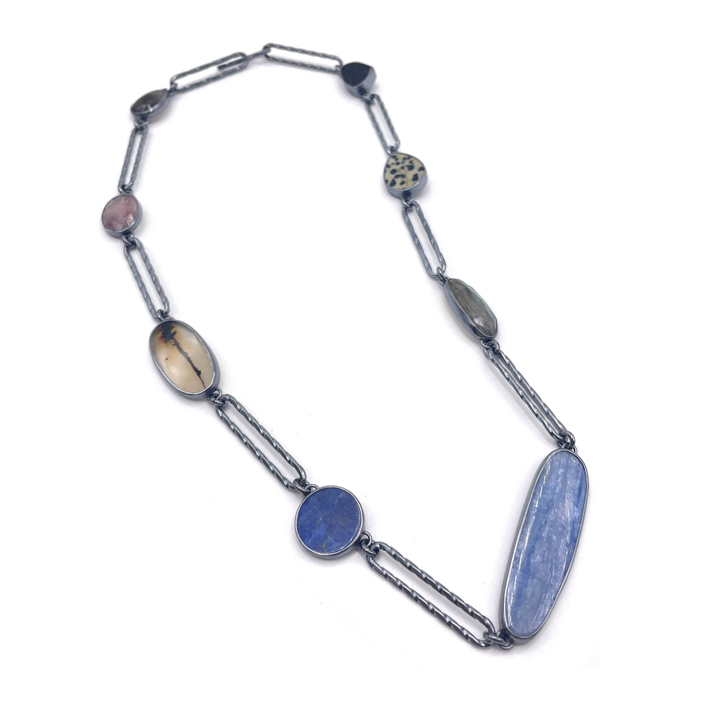 Oxidized sterling silver, smokey quartz, rutilated amethyst, montana agate, lapis, kyanite, labradorite, dalmatian agate, black tourmaline