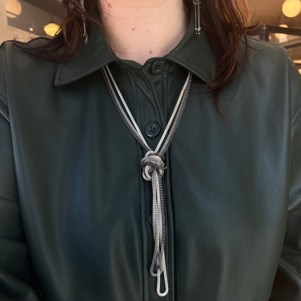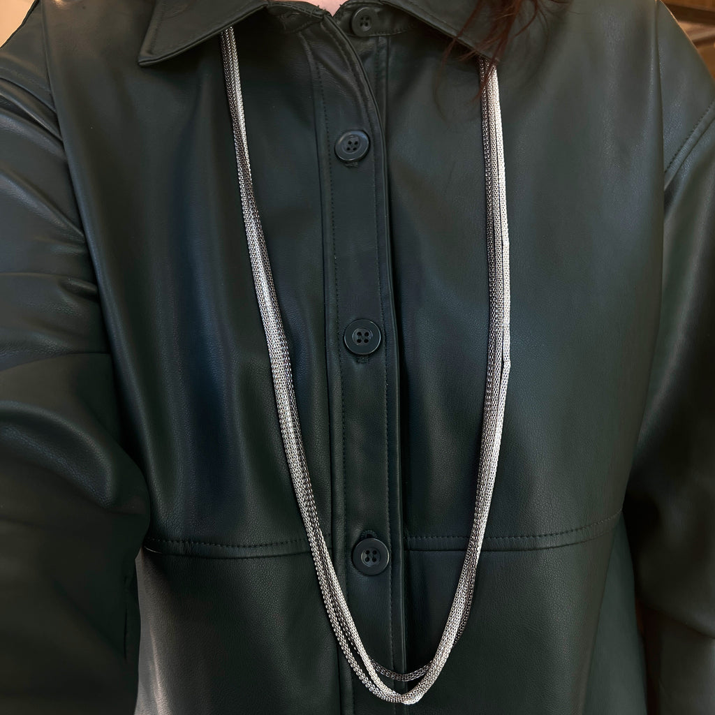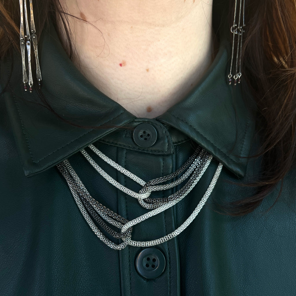 Three necklaces are included—bright silver, dark silver, and gunmetal