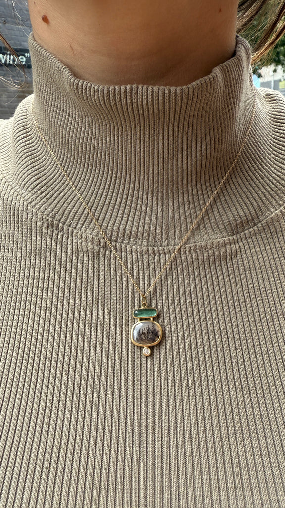 18-karat yellow gold, 10-karat yellow gold, sterling silver, green tourmaline, dendritic agate, diamond: VS 1-2, HI, Ideal cut