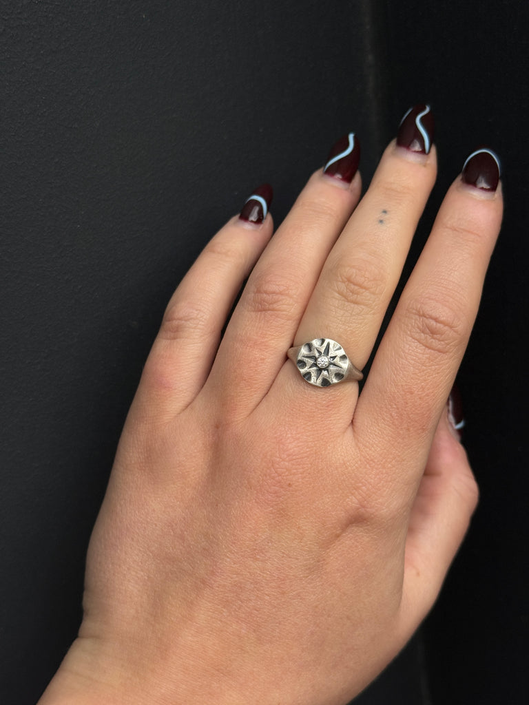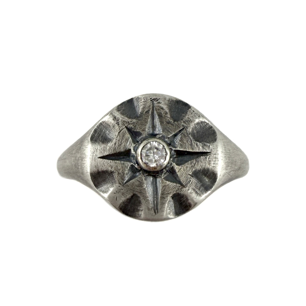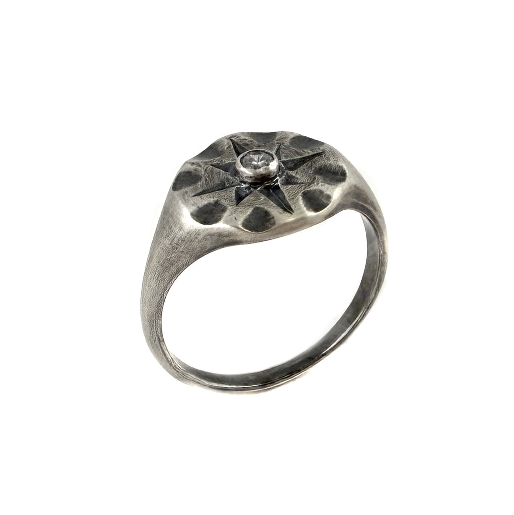 Oxidized sterling silver, hand-pushed engraving, white topaz