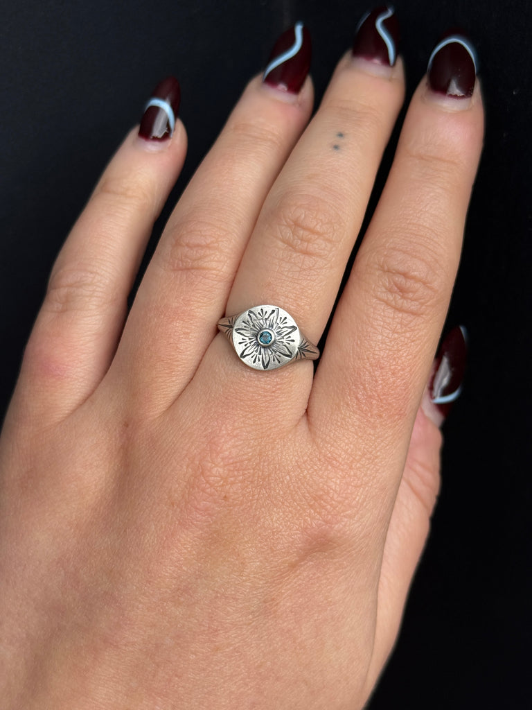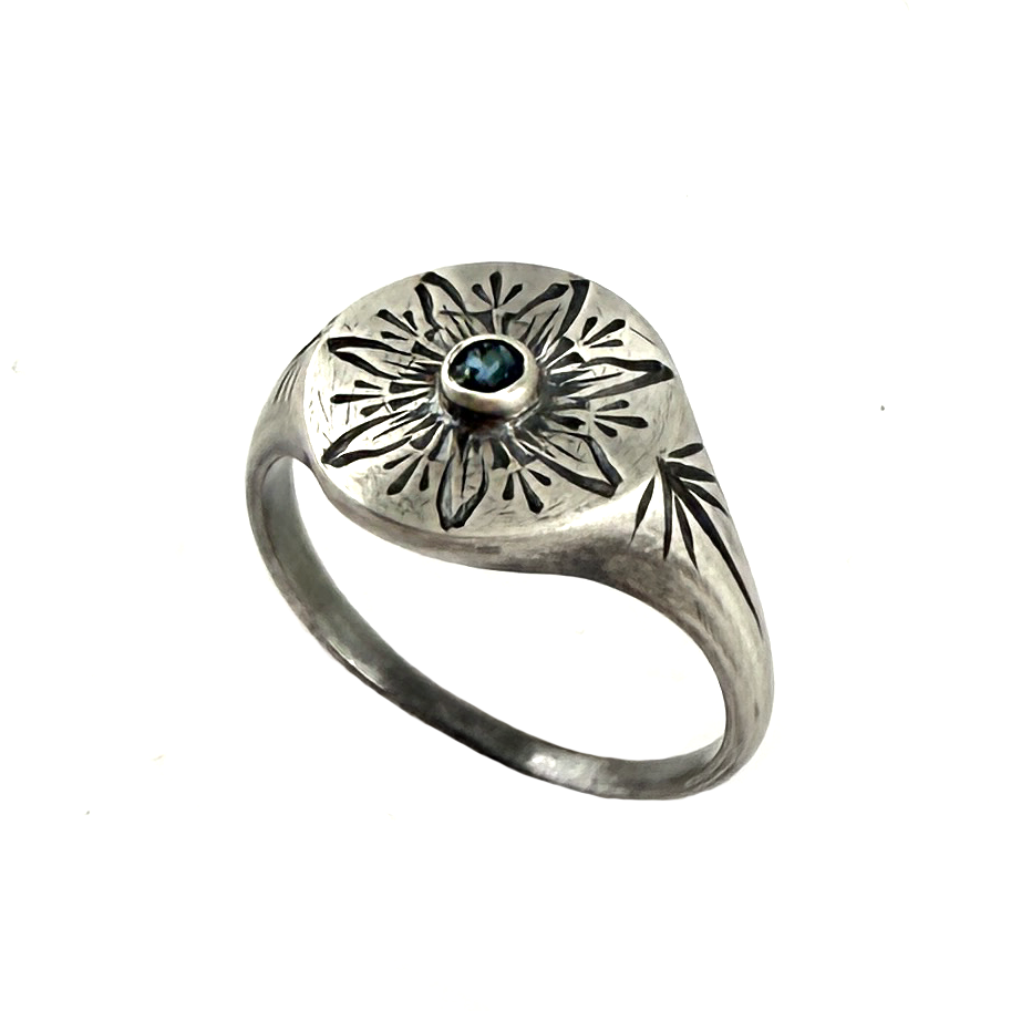 Engraved Pinwheel Flower Signet, London Blue Topaz