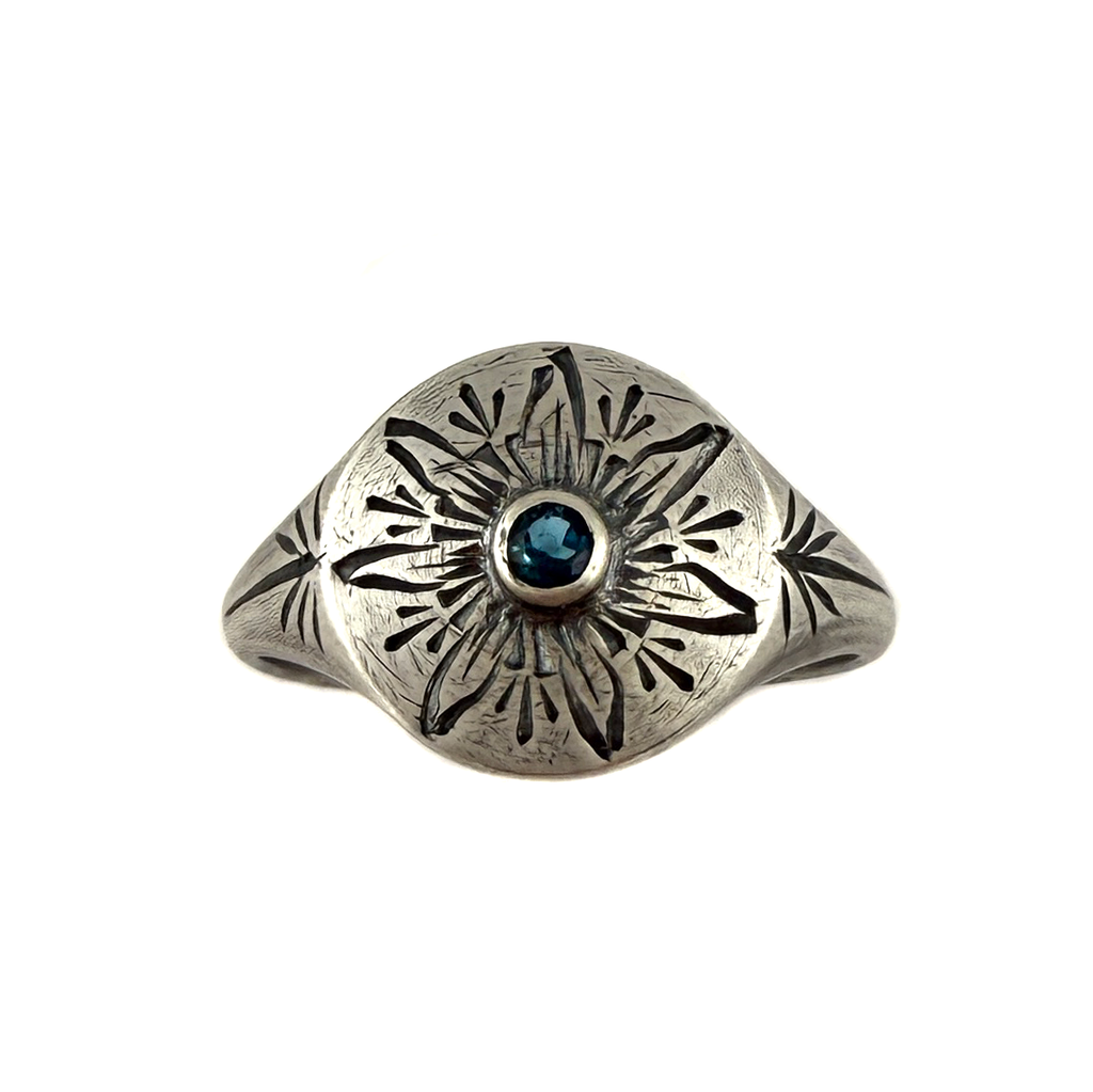 Gena Murfin, Engraved Pinwheel Flower Signet, London Blue Topaz