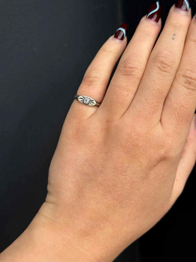 Oxidized sterling silver, hand-pushed engraving, topaz
