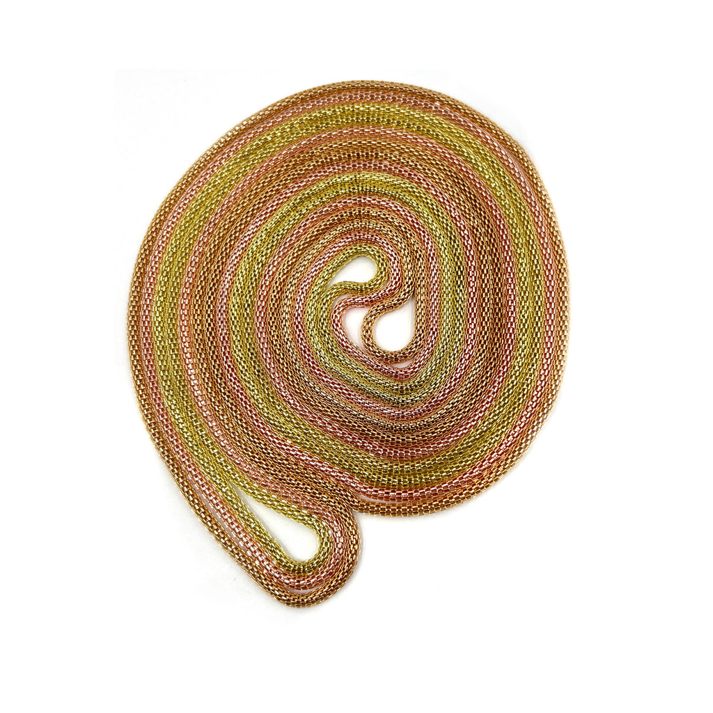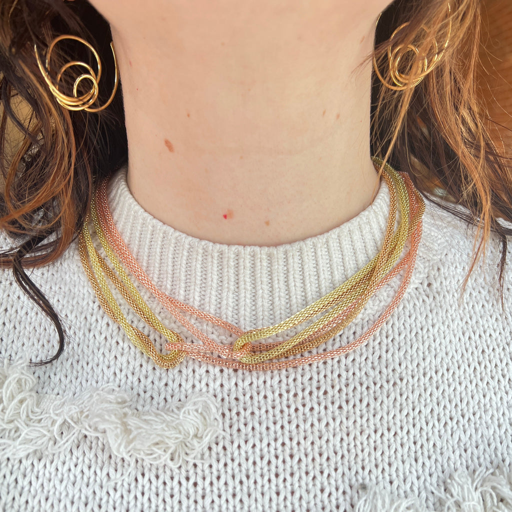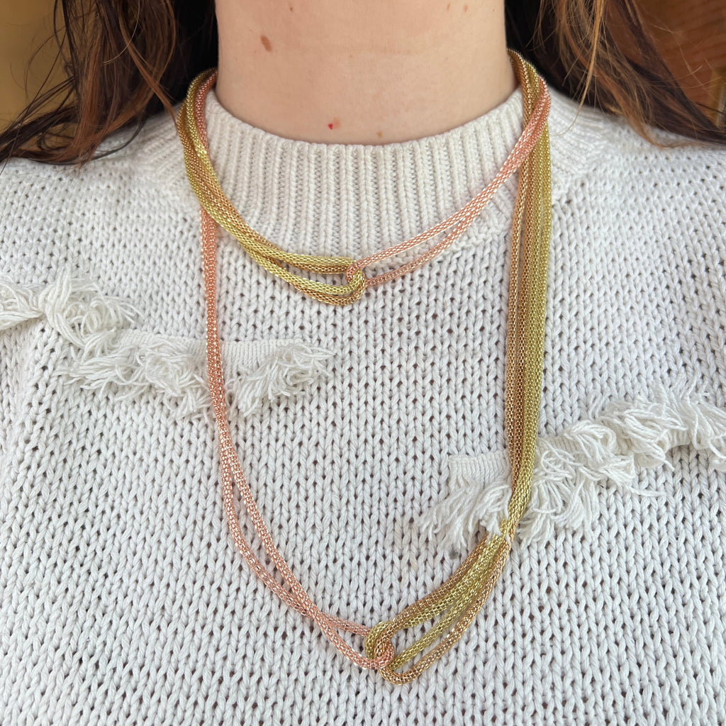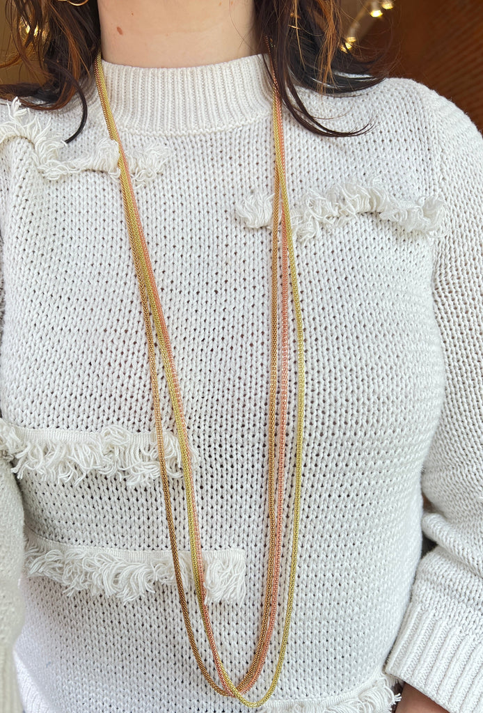 Three necklaces are included—yellow gold, rose gold, and champagne